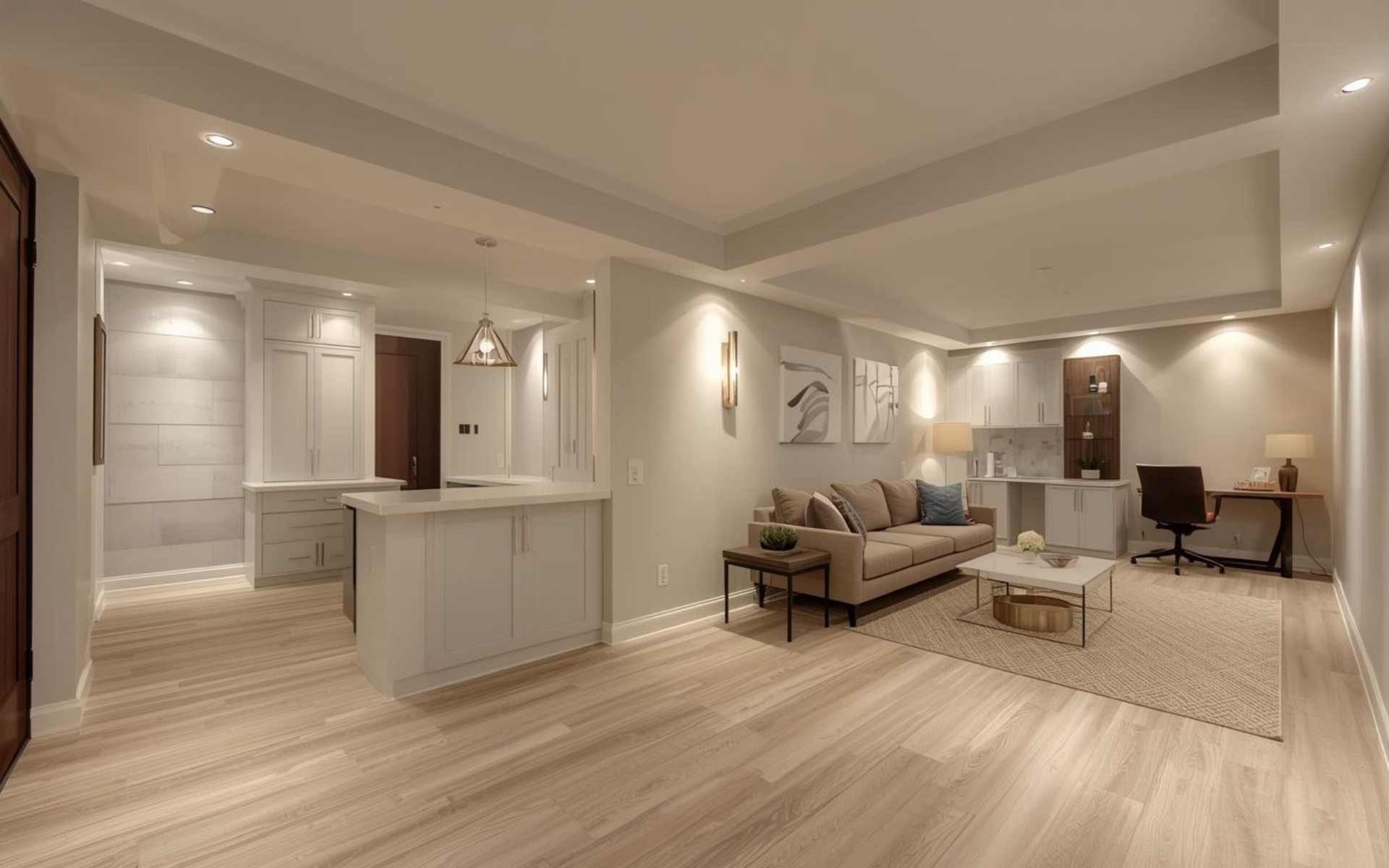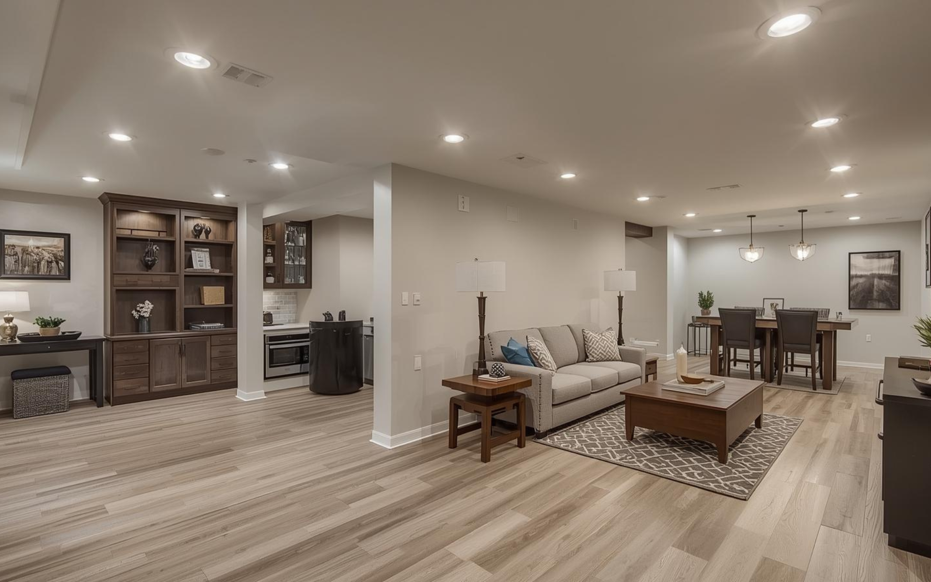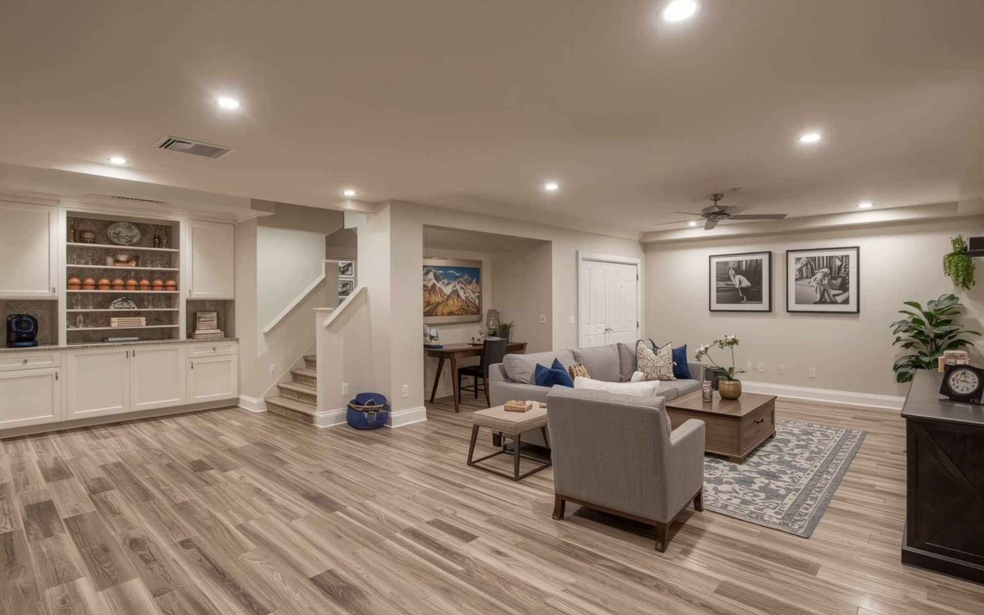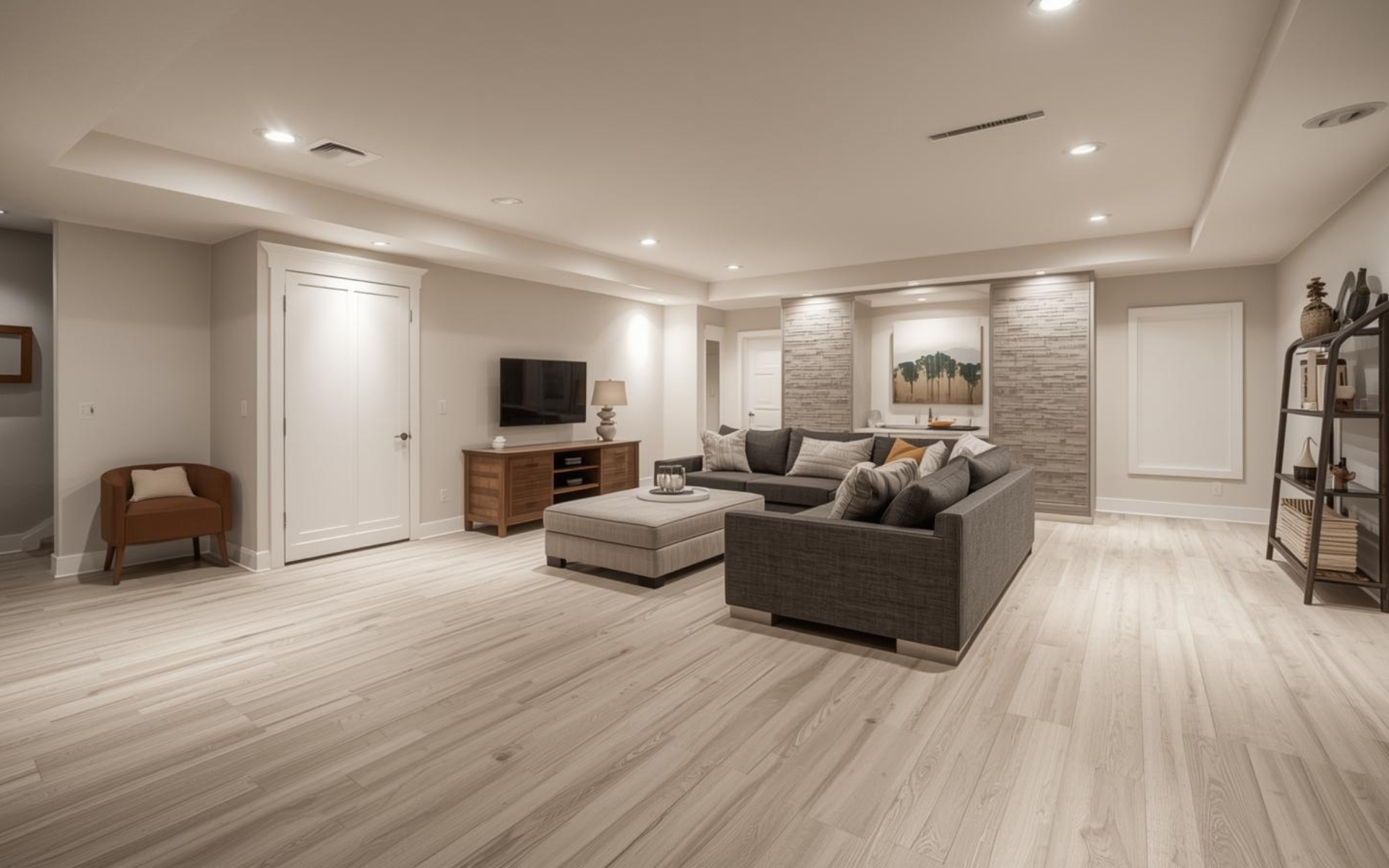 Your finish selections dramatically affect your full basement renovation cost. Luxury vinyl plank flooring costs $3 to $6 per square foot installed, while high-end tile runs $15 to $20 per square foot. Carpet falls in between at $3 to $11 per square foot, including padding and installation.
